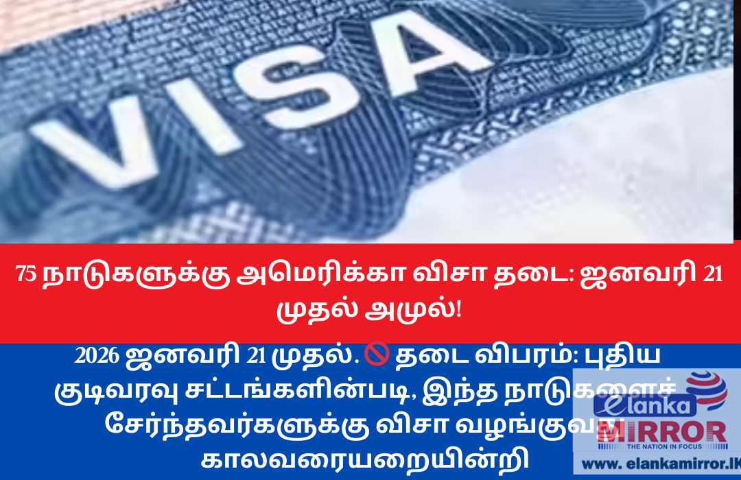அமுலுக்கு வரும் திகதி: 2026 ஜனவரி 21 முதல். 🚫 தடை விபரம்: புதிய குடிவரவு சட்டங்களின்படி, இந்த நாடுகளைச் சேர்ந்தவர்களுக்கு விசா வழங்குவது காலவரையறையின்றி ஒத்திவைக்கப்பட்டுள்ளது. 🌍 பாதிக்கப்படும் நாடுகள்: பிரேசில், ரஷ்யா, ஈரான், ஆப்கானிஸ்தான், சோமாலியா, எகிப்து, தாய்லாந்து மற்றும் ஏமன் உட்பட 75 நாடுகள்