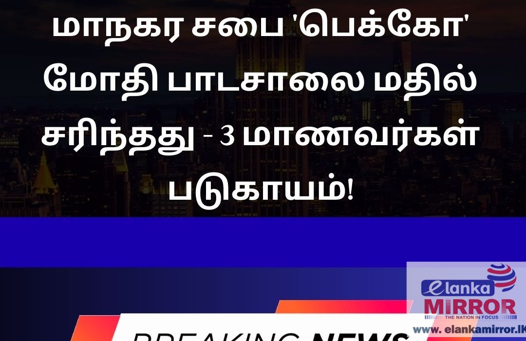 பொரளை பகுதியில் உள்ள பாடசாலை ஒன்றின் சுற்றுமதில் சுவர் இன்று திடீரென இடிந்து வீழ்ந்ததில் 16 வயதுடைய மூன்று மாணவர்கள் படுகாயமடைந்துள்ளனர். கொழும்பு மாநகர சபைக்குச் சொந்தமான இயந்திரம் மோதியதே இந்த விபத்துக்குக் காரணம் என உறுதிப்படுத்தப்பட்டுள்ளது.