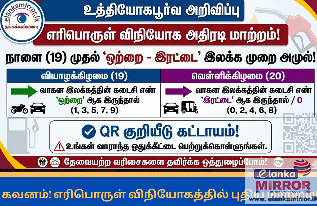 எரிபொருள் நிலையங்களில் நிலவும் நெரிசலைக் குறைக்கவும், விநியோகத்தைச் சீர்ப்படுத்தவும் நாளை (19) முதல் புதிய ‘ஒற்றை – இரட்டை’ (Odd-Even) இலக்க முறை அறிமுகப்படுத்தப்படுகிறது. இதன்படி, உங்கள் வாகன இலக்கத் தகட்டின் கடைசி இலக்கத்தைப் பொறுத்தே எரிபொருள் வழங்கப்படும்.