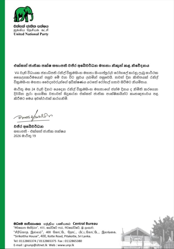 - வெற்றிகரமான சிகிச்சை: முன்னாள் ஜனாதிபதி ரணில் விக்ரமசிங்க சிங்கப்பூரில் உள்ள தனியார் மருத்துவமனையில் திட்டமிடப்பட்ட அறுவை சிகிச்சை ஒன்றினை மேற்கொண்டார். அந்தச் சிகிச்சை மிகவும் வெற்றிகரமாக நிறைவடைந்துள்ளது.
