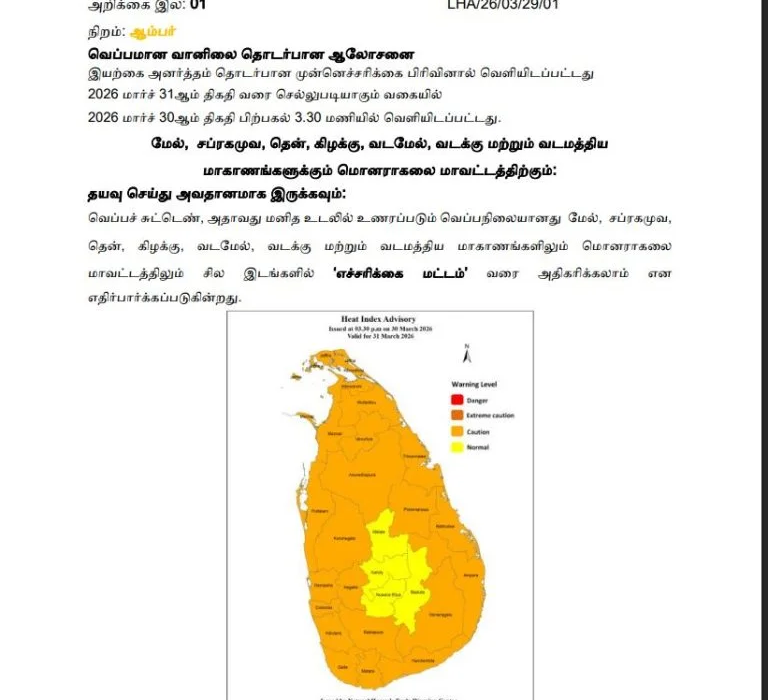 இலங்கையின் பல பகுதிகளில் நிலவும் வெப்பமான வானிலை தொடர்பான புதிய ஆலோசனையை வளிமண்டலவியல் திணைக்களம் வெளியிட்டுள்ளது.
