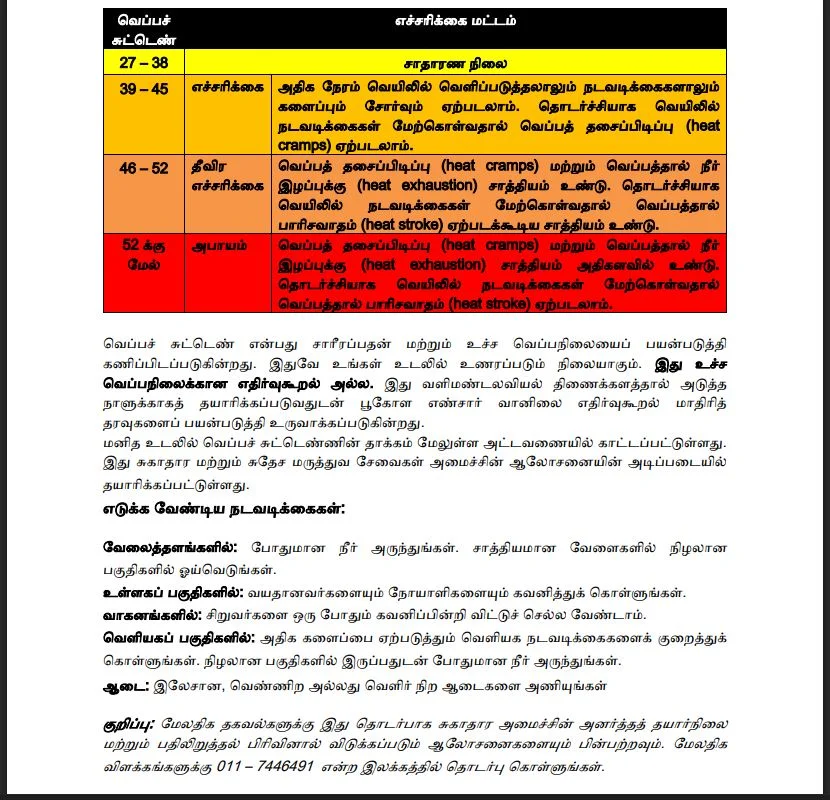 - ஏனைய சில மாவட்டங்களில் மனித உடலால் உணரப்படும் வெப்பம் ‘அவதானம்’ செலுத்த வேண்டிய மட்டத்தில் இருக்கும் என எதிர்பார்க்கப்படுகிறது.